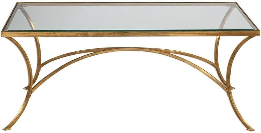 Modern and glamorous elements team up to make this clean-lined coffee table an eye-catching accent in your living space. Its open metal frame features four curved concave legs and arched support braces, all finished in an antiqued gold leaf hue for a vintage touch. Above, the tempered glass top provides space to show off fresh flowers, a stack of coffee table books, and a collection of coasters. Plus, it’s super simple to clean. Since this console measures 48″ wide, it’s an ideal option for big and small living rooms alike.